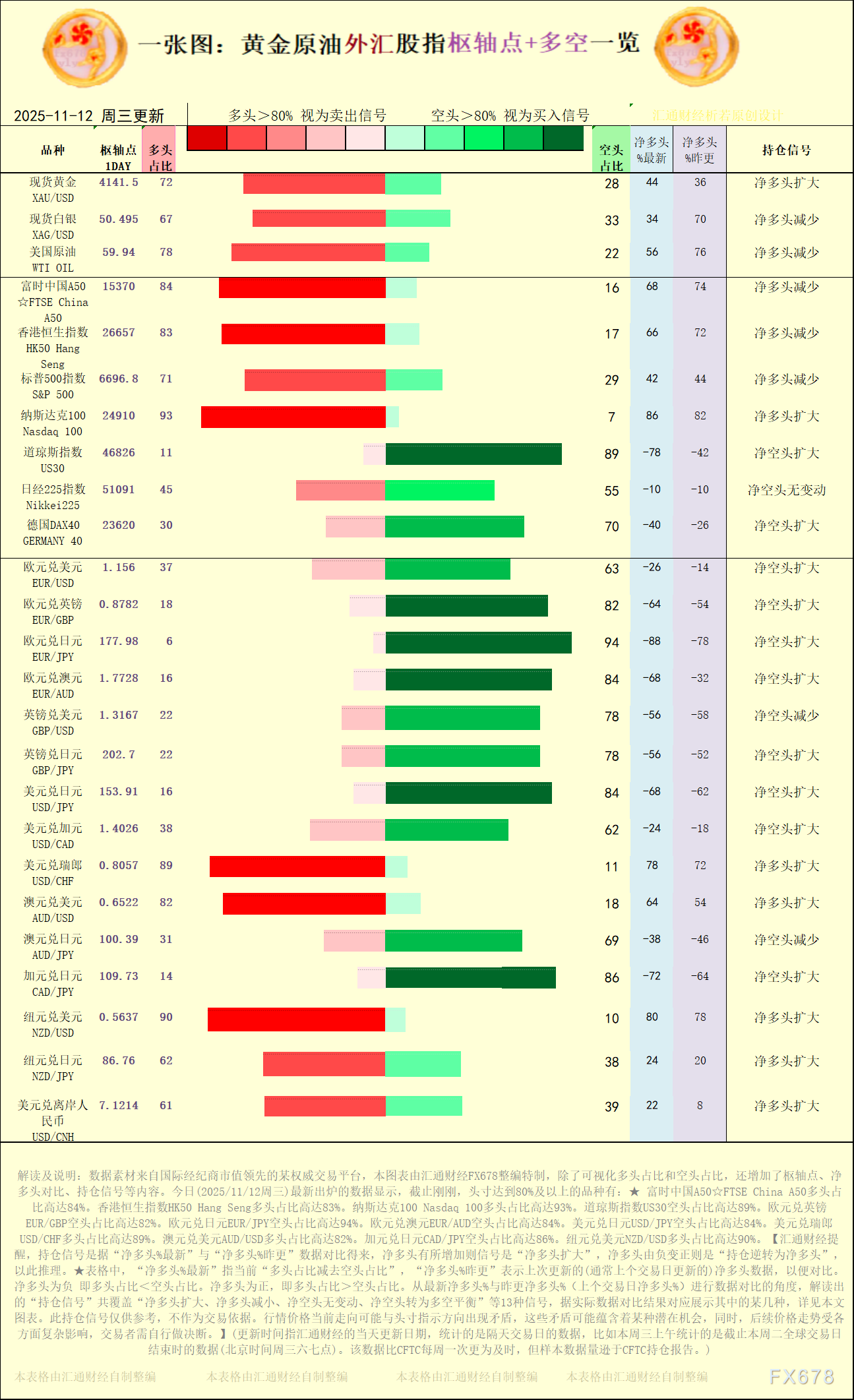 ex开户注册一张图:2025/11/12黄金原油外汇股指“枢纽点+多空持仓信号”一览