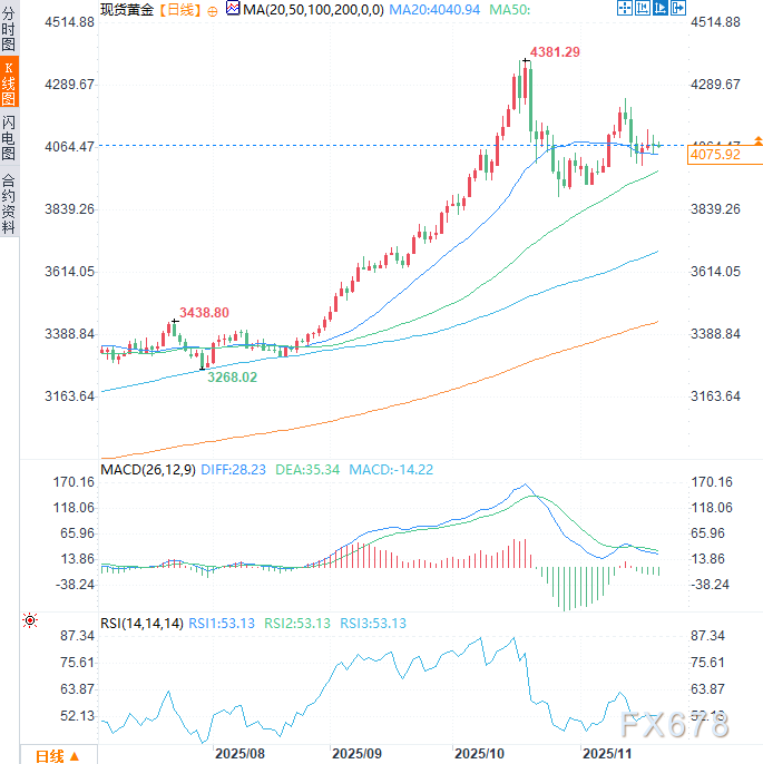 汇通财经APP讯——周五(11月21日)现货黄金震荡下行,跌约0.60%至每盎司4050美元附近。前一交易日现货黄金剧烈震荡,最终稳收报4077.17美元/盎司,周四最高冲至4110.03美元,最低跌至4038.82美元。此前因延迟数月发布的美国9月非农就业数据带来的涨幅已悉数回吐。当前金价较10月创下的历史高点(4381.29美元)仍低约7.00%,2025年已涨55%的惊人涨幅。