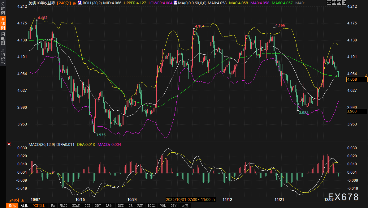 从技术层面审视,10年期美债收益率在240分钟图上的走势显示短期上行动能有所减弱。当前报价4.058%已跌破布林带(参数20,2)中轨4.066%,并向靠近下轨4.004%的方向移动。MACD指标中,DIFF线(-0.011)已下穿DEA线(0.013),虽仍处零轴上方,但柱状图已转负,提示短期调整压力。这表明收益率在测试近期高位后,遇到了明显的技术性抛压和获利了结盘。