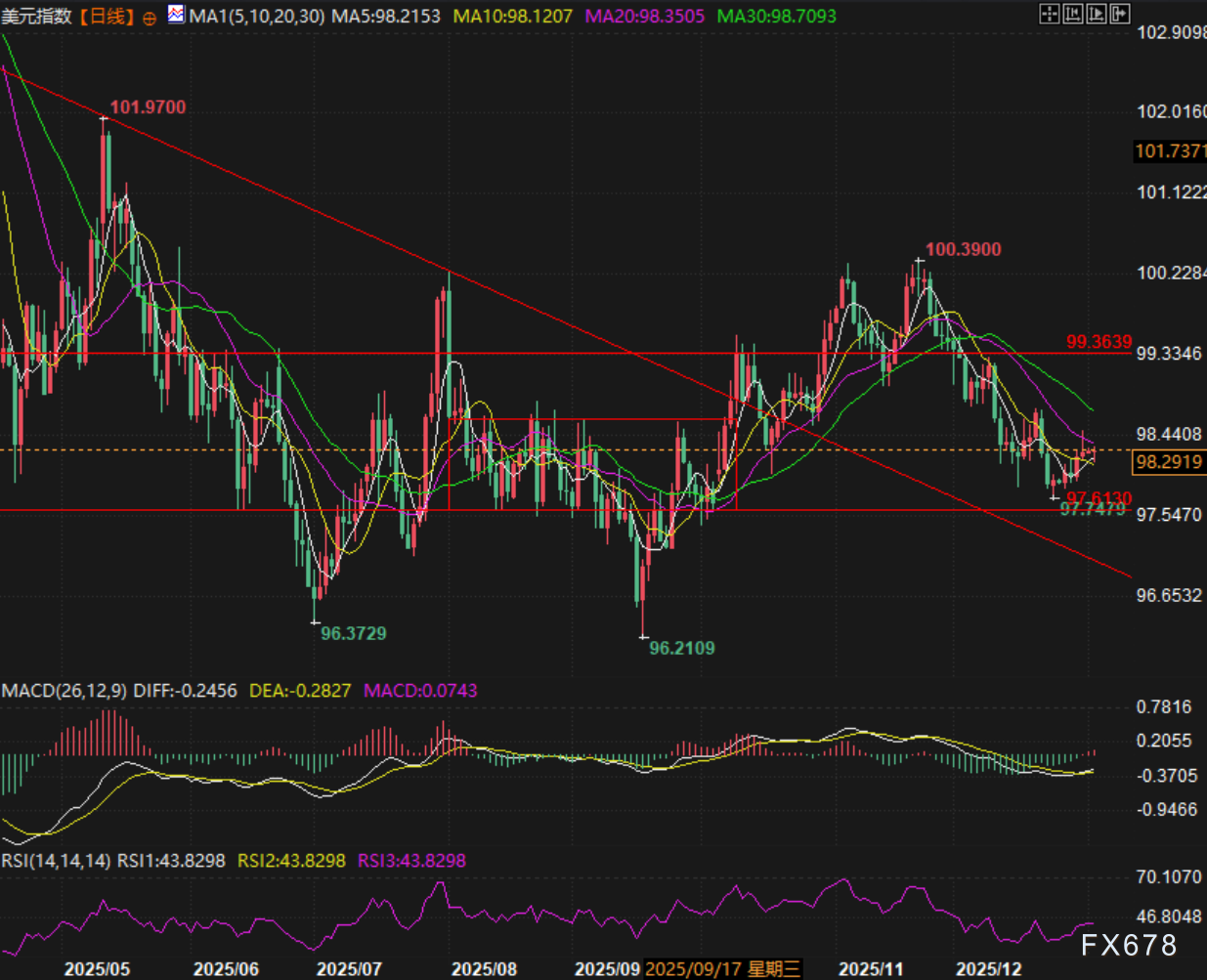 技术面,美元指数反弹超过了前方红色箱体一半的位置,在5日线之上,有走逐渐走强的征兆,压力在98.50附近。