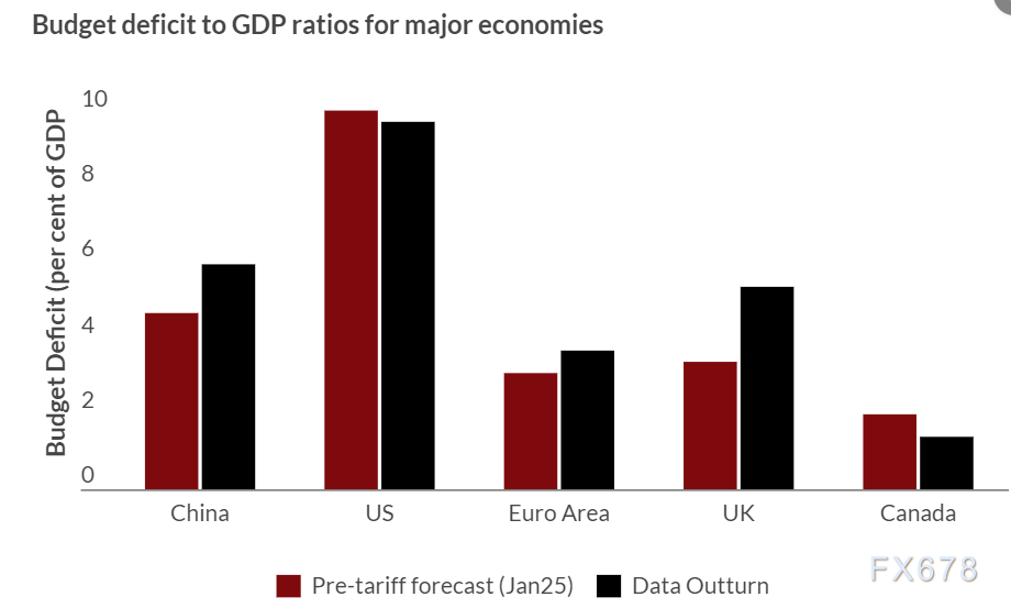 在通胀层面,关税生效后的预测数据显示,美国通胀率将升至2.7%,全球通胀率则降至6.6%,二者呈现出截然相反的走势。